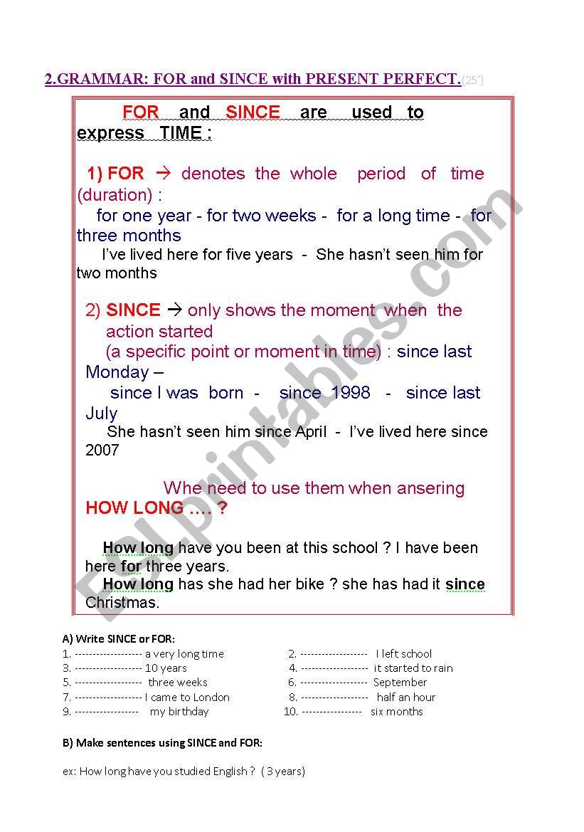 Students have the grammar table for uses of since and for, then three exercises to complete and make sentences and in third place they have a very interesting pair-work speaking activity in which they have to ask his/her partner how long…?and the other has to answer with since and for. Finally they have some homework. This worksheet is done with some documents I downloaded from here, but I modified them and make new additions.