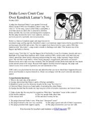 This is a free ESL (English as a Second Language) lesson for teachers and students titled "Drake Loses Court Case Over Kendrick Lamar’s Song". It includes interactive reading comprehension quiz and printable PDF files.