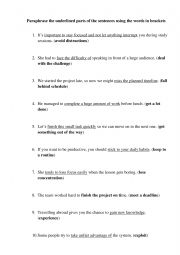 It is a useful task for B1+ learners where students need to paraphrase the underlined parts of the sentences using the words in brackets.
