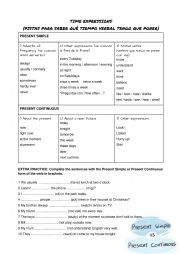 Time expressions for Present Simple and Present Continuous and an exercise to practice.