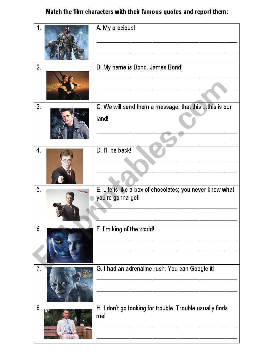 Super challenging activity for teens. First, they are to match the famous quotes with the pics showing the speaker from the famous films. Then, they report the quotes. After that they can make the similar challenge for each other!