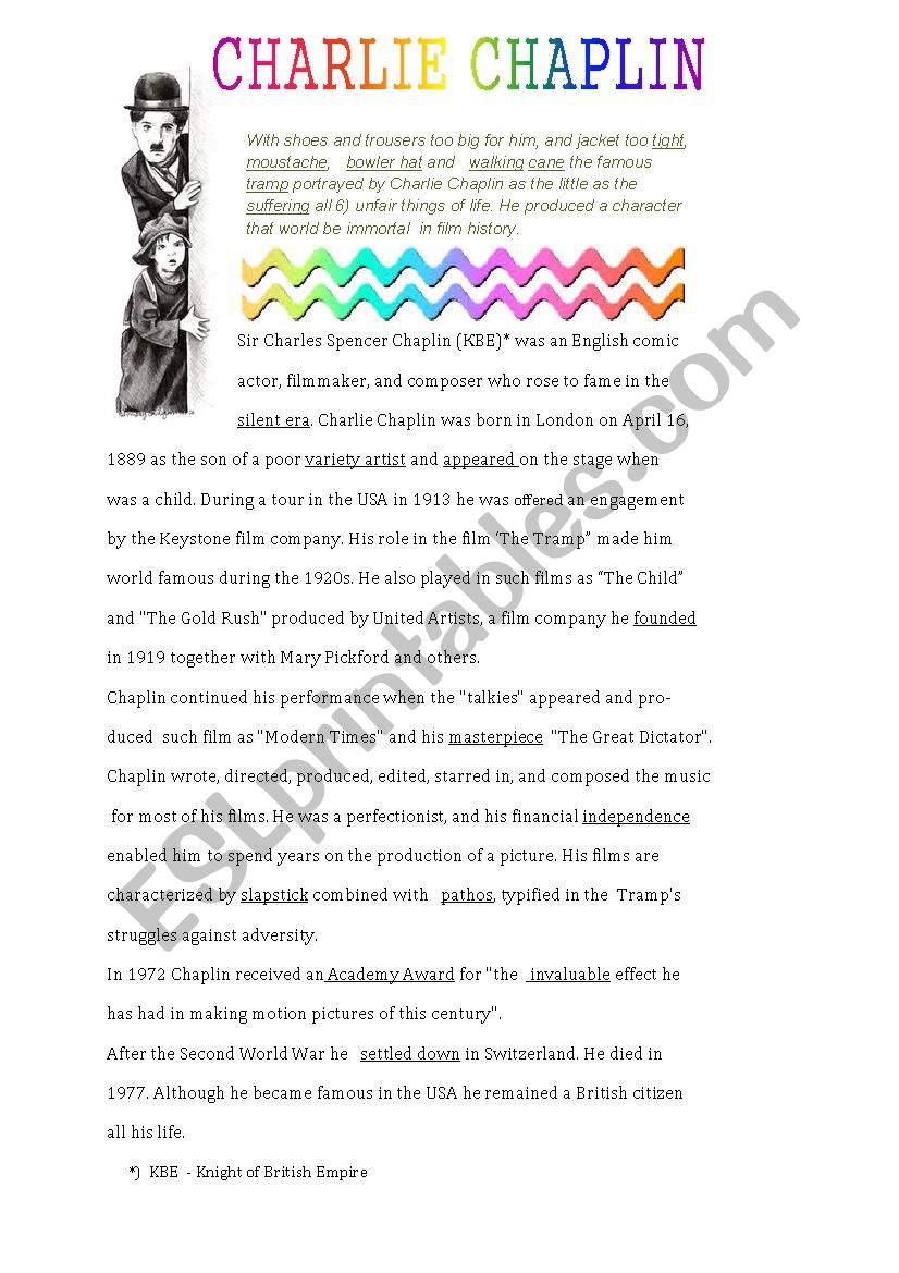 The biography of Charlie Chaplin followed by the exersice to report the direct speech.