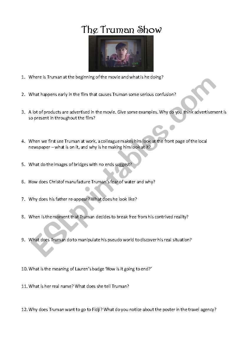20 questions to be answered by students while watching the movie The Truman Show. The aim is to have the students react on the theme of the film after watching it.