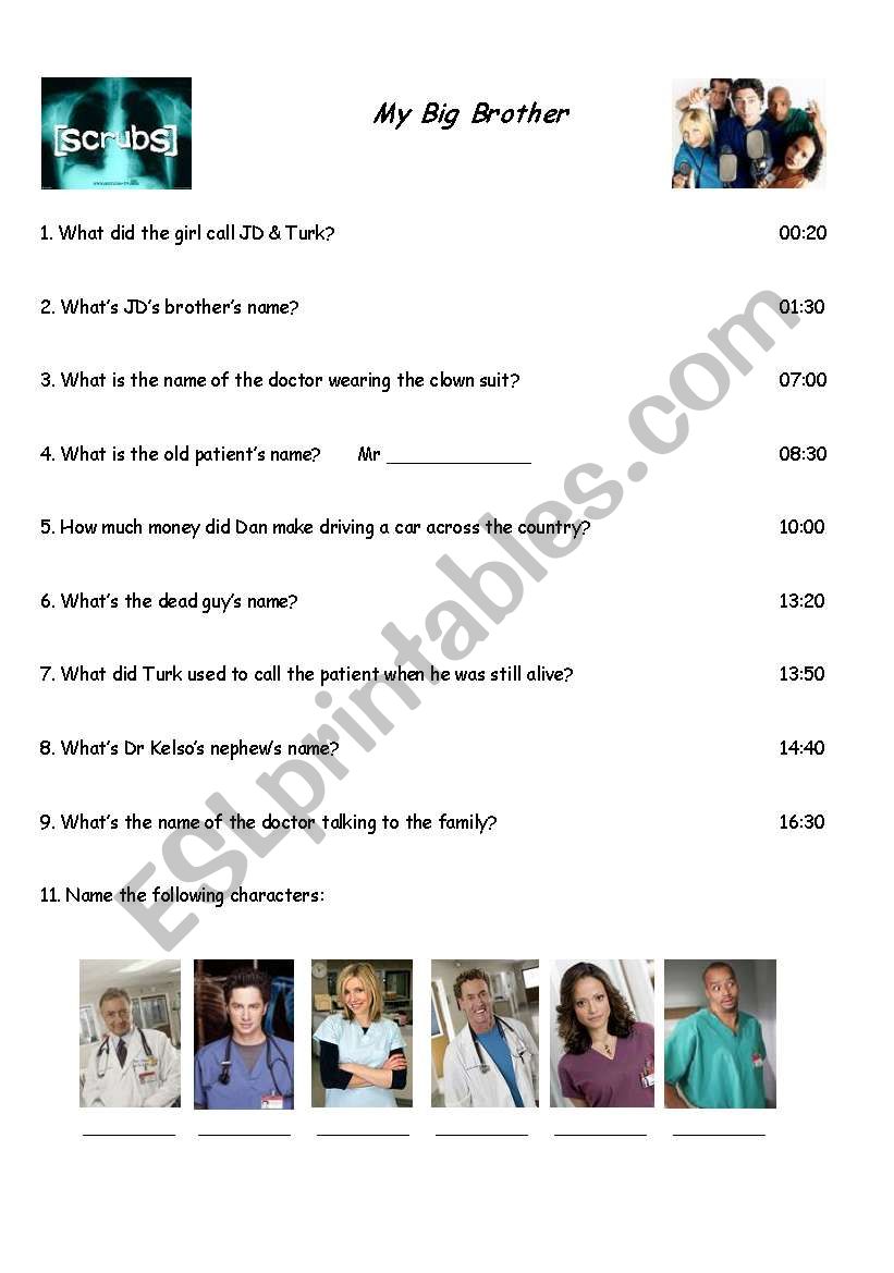 Comprehension worksheet to be used in conjunction with Scrubs (Season 2 Episode 6 ´My big brother´. Enjoy