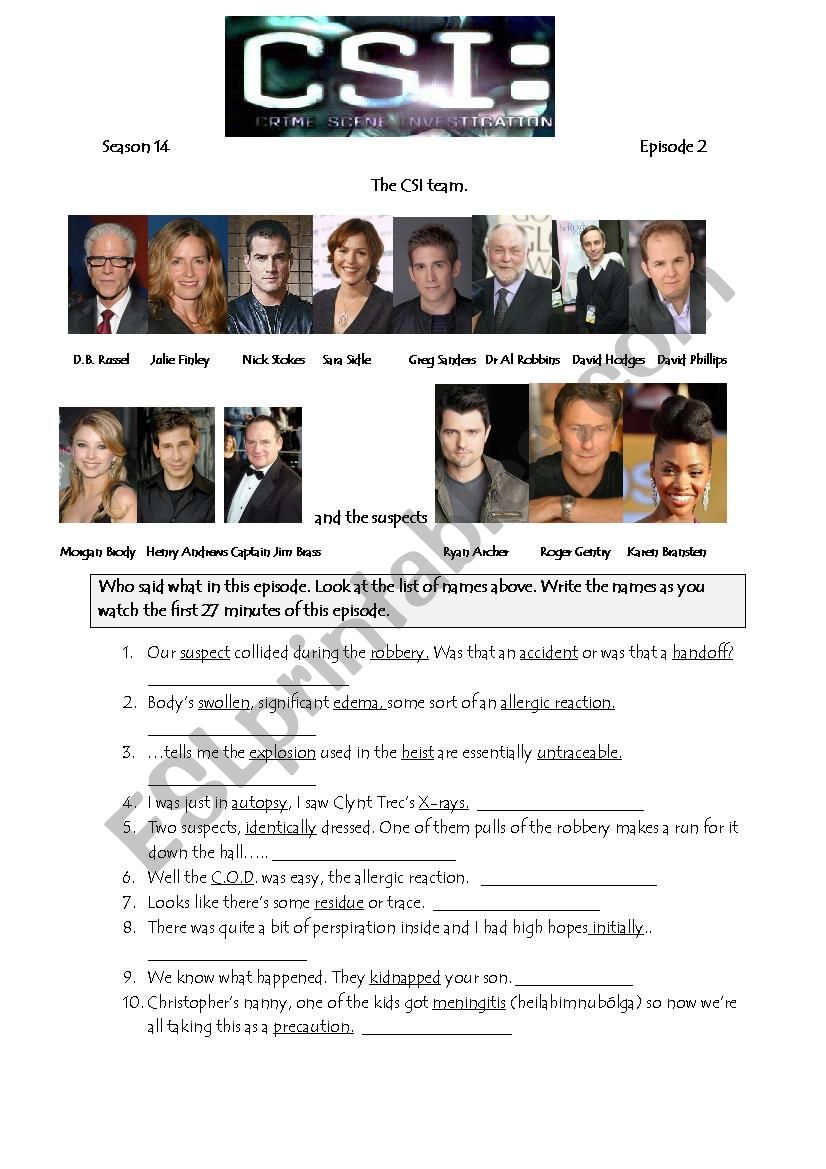 This is an activity to do while watching CSI. Season 14 episode 2. Working with crime words and summarizing the episode at the end.