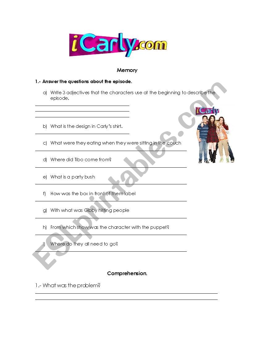 This is a worksheet about ICarly, there are a few memory questions, and ssome comprehension questions, hope you like it