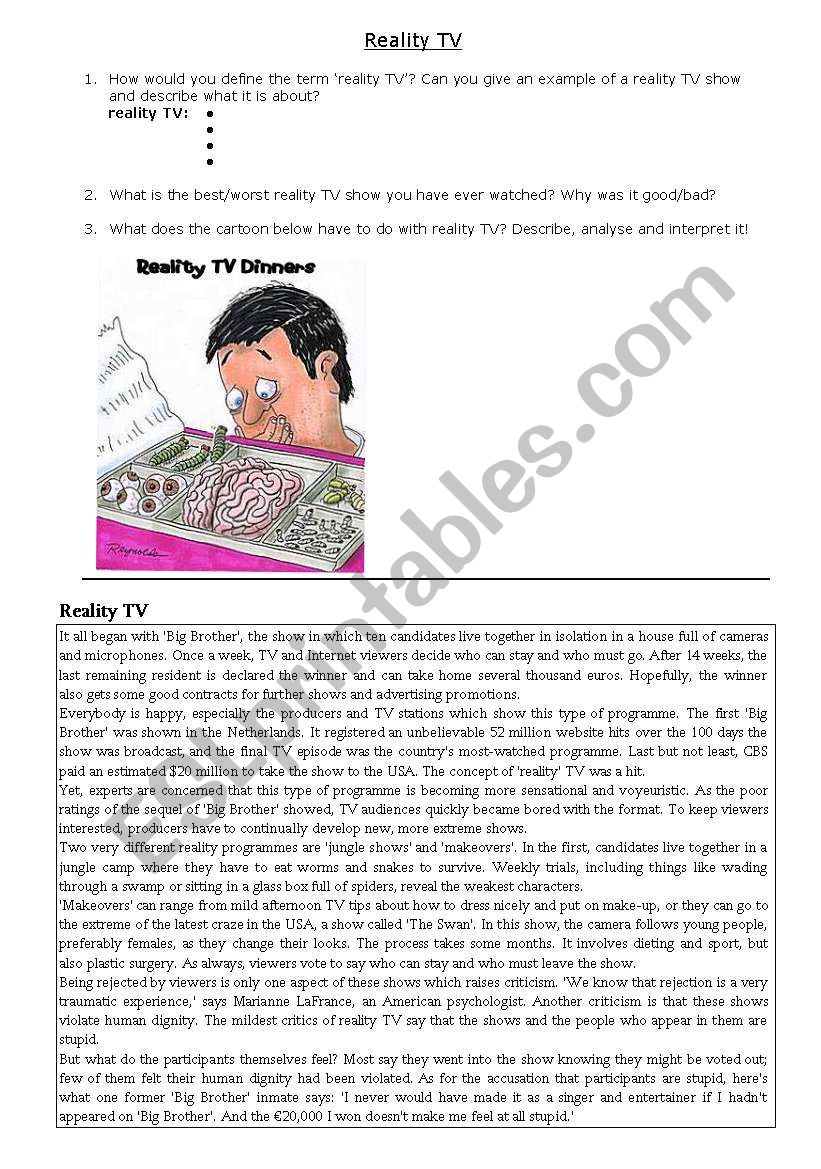 Worksheet about reality TV with different activities, such as a cartoon, a text with vocabulary excercises and questions for discussion. On the second page, there´s a matching exercise about British reality TV shows.