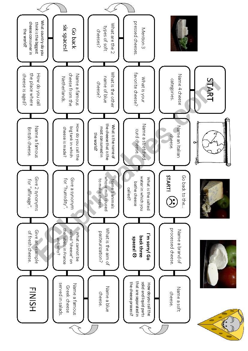 A board game to review some vocabulary about cheese with items on the cheese making process (curds, whey, brine, etc.), types of cheese (soft cheese, blue cheese, etc.), and famous national cheeses (feta, mozzarella, comté, etc.)
