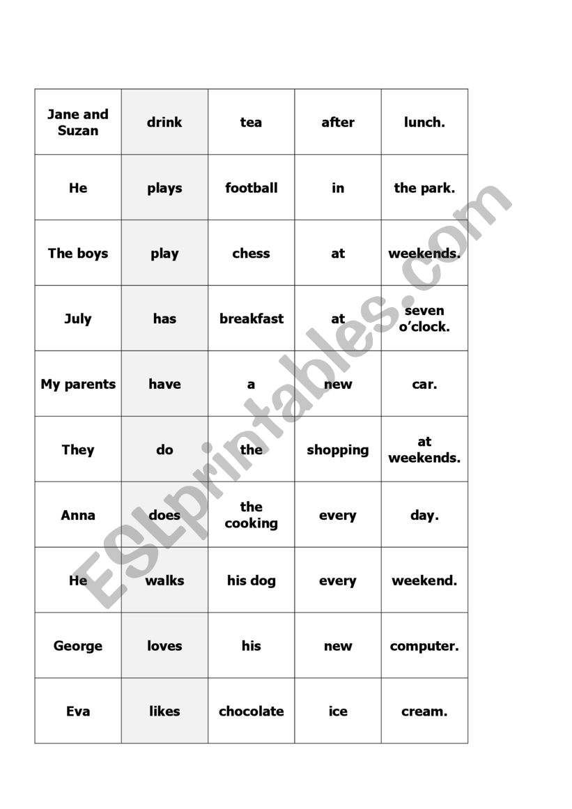 Print this worksheet, laminate and cut. Kids have to create sentences from these cards (more than one correct solution). This activity helps them with making sentences because they can move the card to the correct place and write it down when everything is OK. I have really good experience with this and similar activities :-)