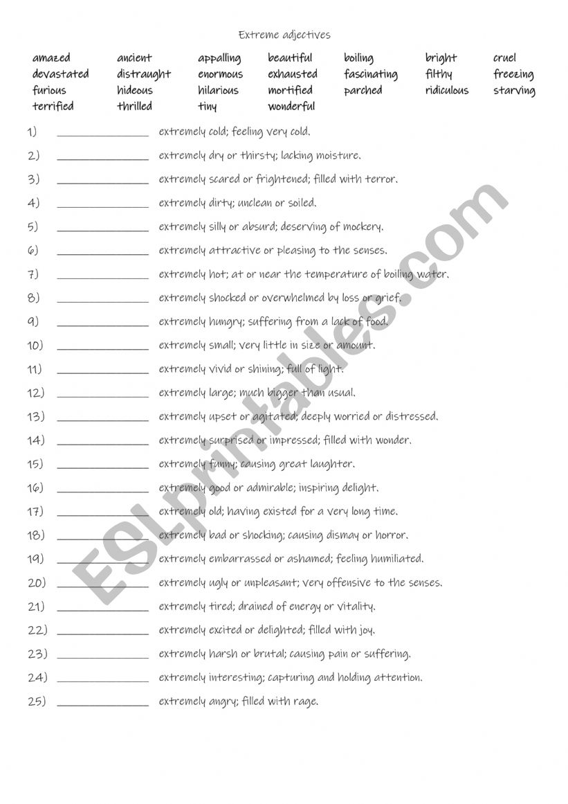Extreme adjectives, like "fantastic" or "awful," allow students to express strong emotions more effectively, making their language more vivid and impactful. Learning these adjectives expands their vocabulary, making them sound more fluent and confident when speaking or writing in English.First students familiarise themselves with the 25 extreme adjectives and their meanings. Then they read the definitions and write the adjective beside the correct meaning. Answers on page 2.