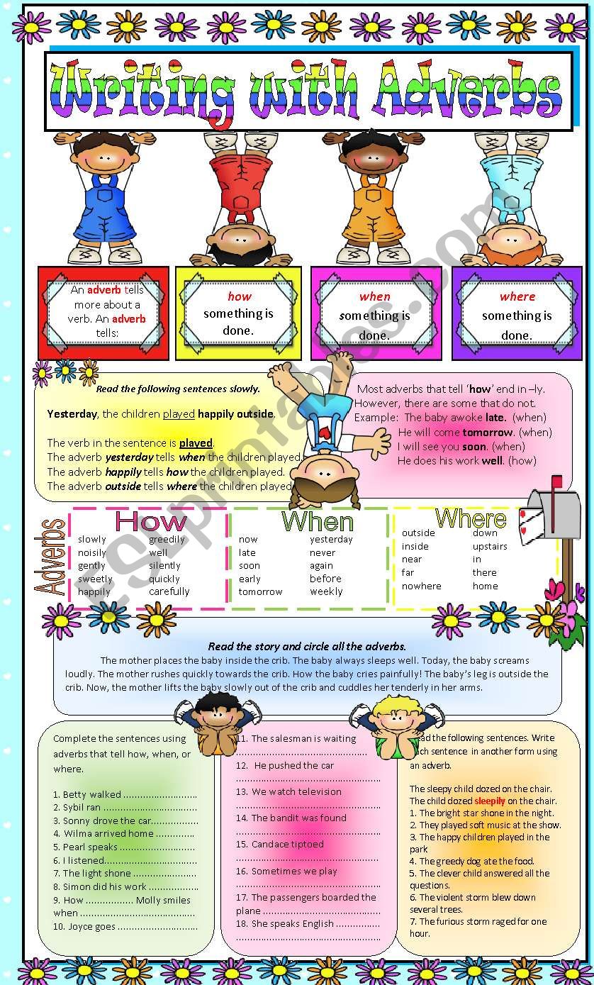 Students are given extra practice writing with adverbs. A detailed explanation and examples are shown. Students complete three different tasks. Ws is editable a B/W version and Answer key included Happy weekend - Much love.