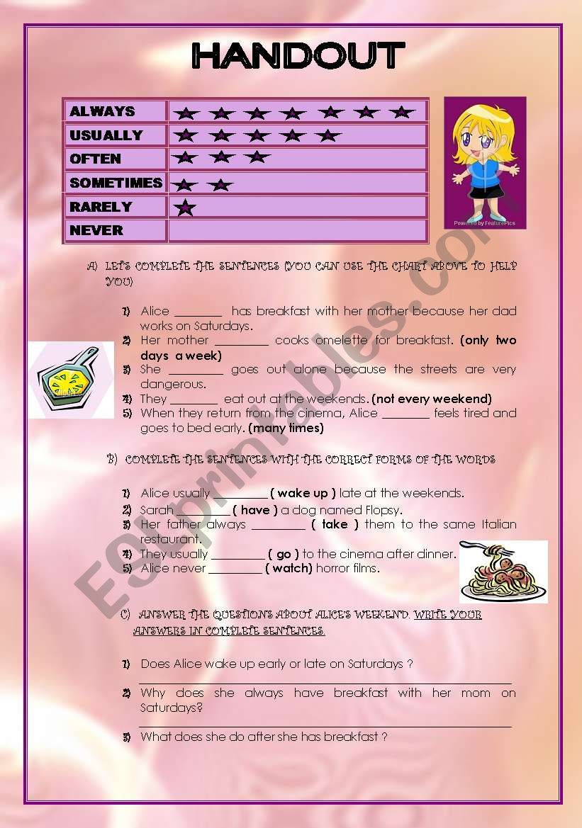 This is the worksheet of my Powerpoint presentation. You can use it after the ppt "Alice´s Weekend". Enjoy it.