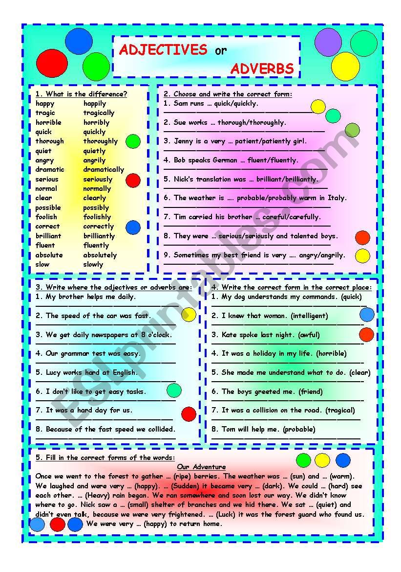 Five exercises on Adjectives and Adverbs:find the difference between them, choose the correct form, find the Adjectives and Adverbs, fill in the correct form in the correct place, a short story. This ws can be used for training, revision and tests. Thank you!!!