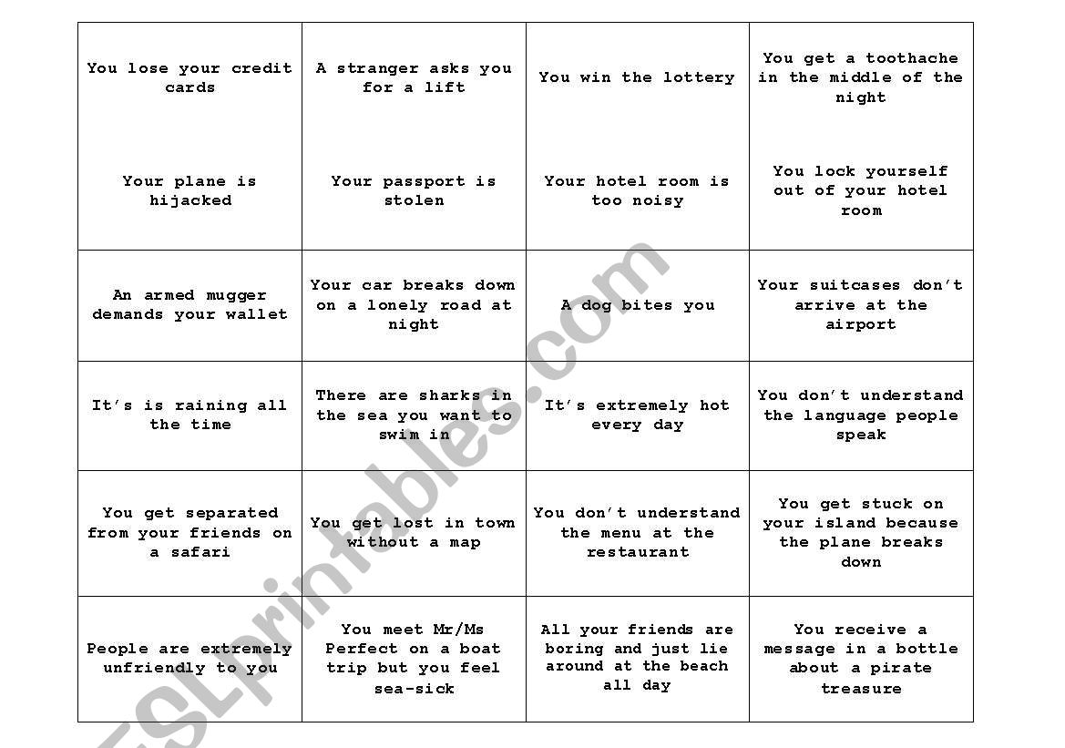 Print cards onto coloured cardboard and cut up. Print as many sheets as you want to make groups in your class. Give each group a heap of card. Each player picks a card and has to use the information in a first, second or third conditional sentence.
