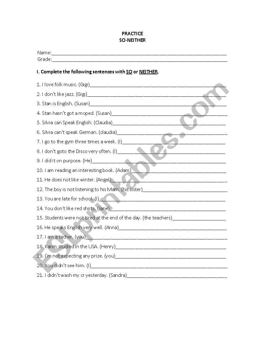 Grammar worksheets > Connectors > So/neither > PRACTICE SO-NEITHER