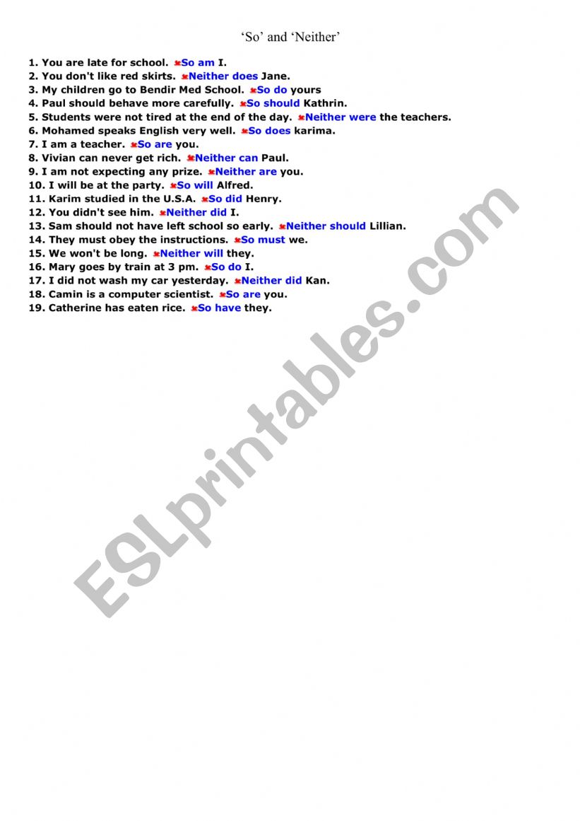 Grammar worksheets > Connectors > So/neither > "so" and "neither"