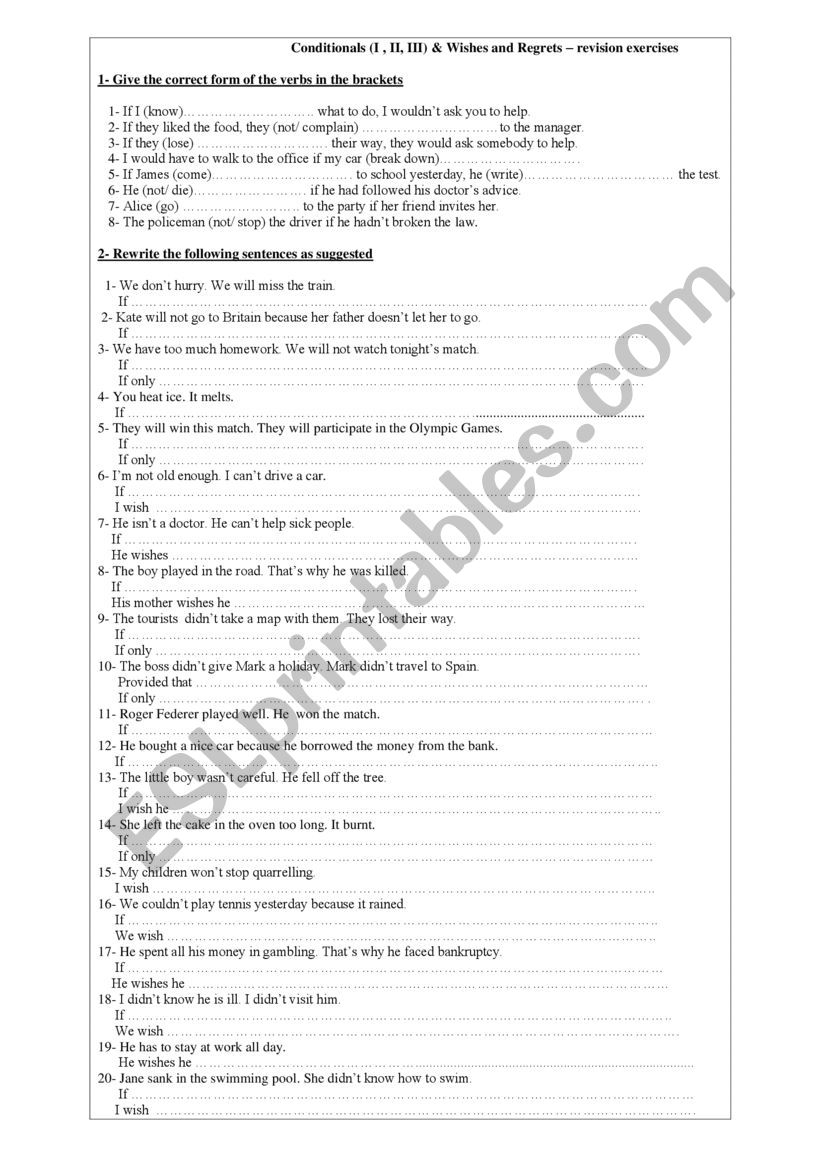 Conditionals, wishes and regrets worksheet