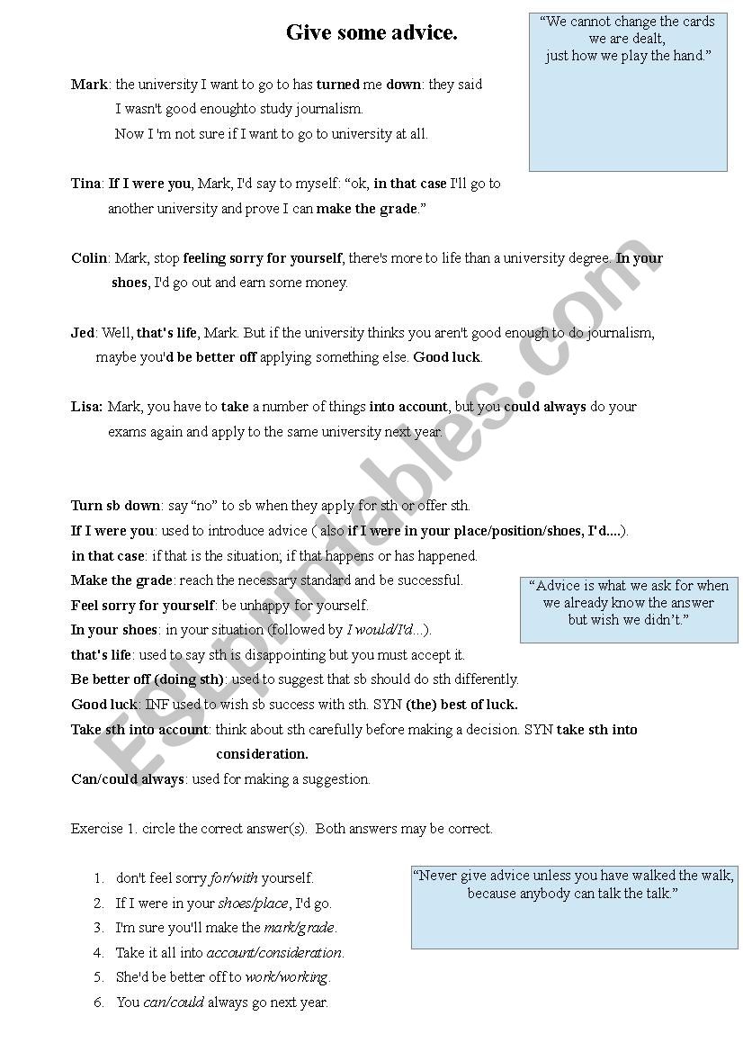 this activity is designed to let the students to give their own opinion about one topic. The teacher chooses the issue (loose weight, change job, quit to smoke, travelling...) and let them give their own opinion about that. Interesting is also let the students ask their classmates for some advice about a personal problem.