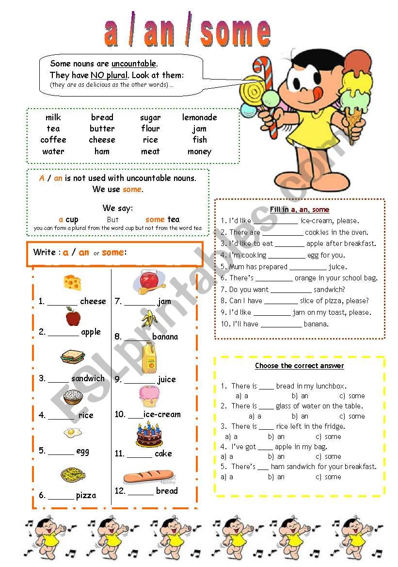 a - an - some / countables and uncountable nouns worksheet