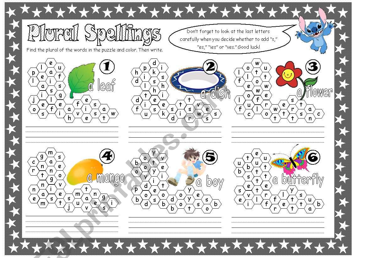 Based on DedicatedTeacher´s brilliant idea and template, which I have adapted with her kind permission. This worksheet deals with the regular plural spellings -s, -es, -ies and -ves. Students find and color the plural in the mini wordsearch and then write it on the lines. ANSWER KEY INCLUDED. Sorry I couldn´t fit it all in one document so it is in 2 parts. Hope all have a nice week. Hugs, Julia.