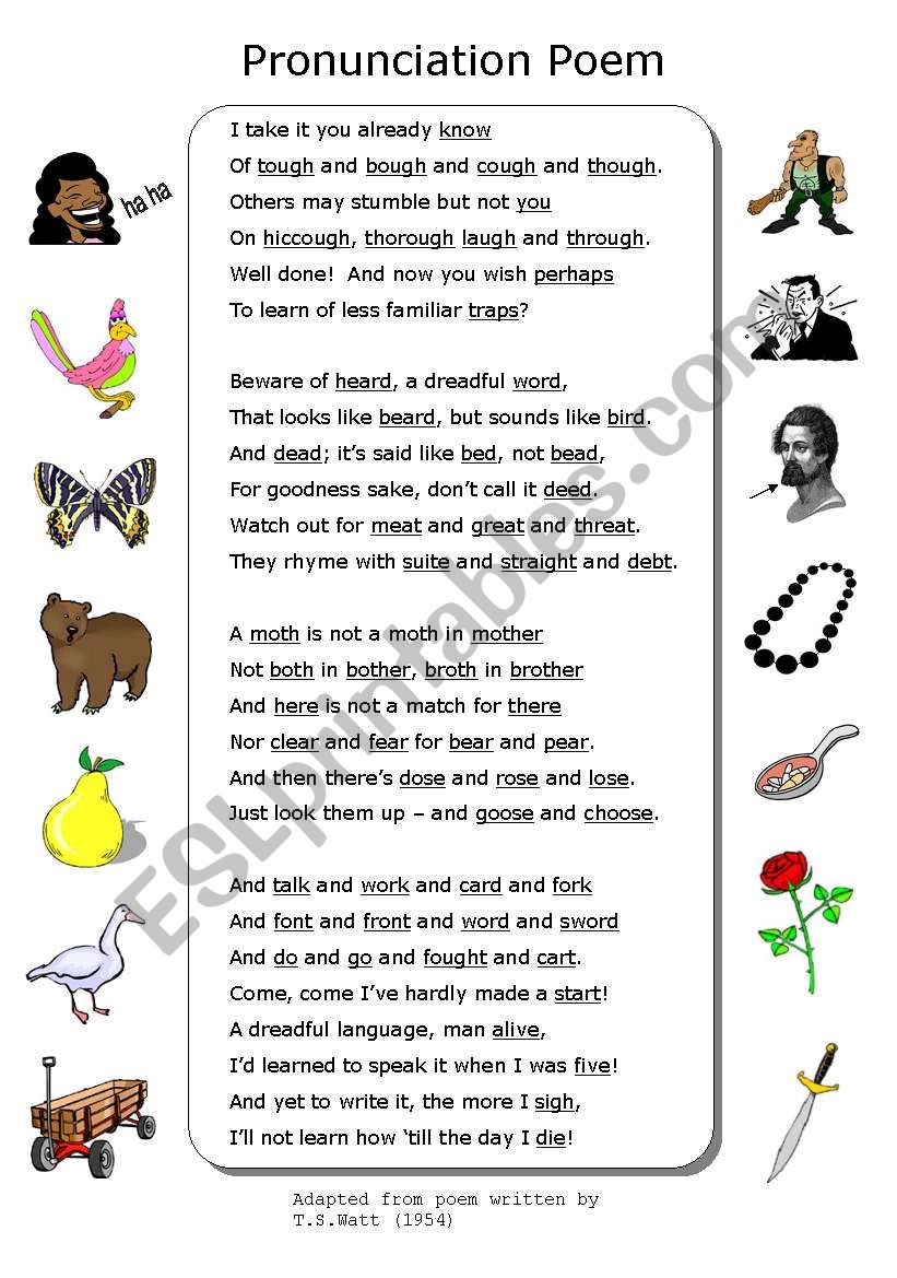 This is for upper-int students who wish to learn the phonetic chart. Pairs first do the puzzle, guessing the word from the sounds. Students then guess the words and match them with their definitions. Pairs then orally gap fill the phonetic chart, making the underlined sound for each phoneme. Then, read the poem to the class, asking class to beat out rhythm. The whole class then reads it, then in pairs. (you could ask the class to perform it). Students then put all the underlined words in the poem in the correct place in the table.