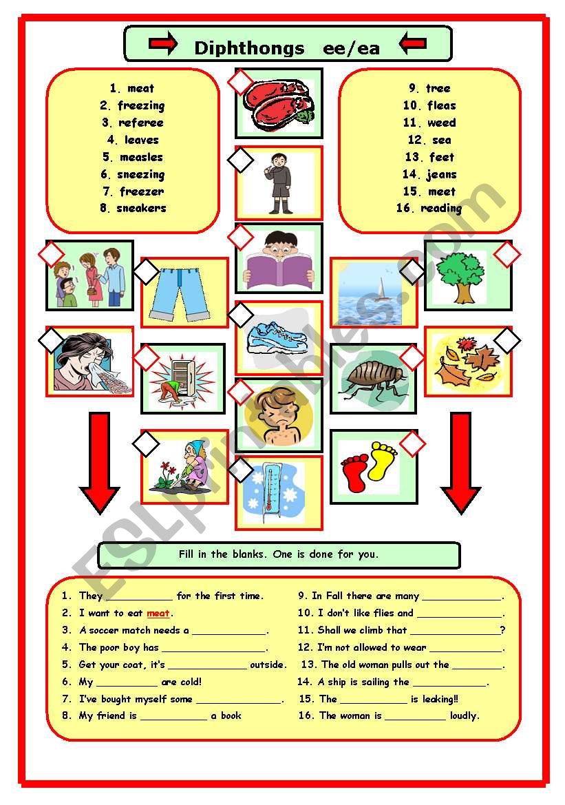 A simple ws (diphthong ee/ea). Sts have to label the pictures and fill in the blanks with the given words. I hope it´s useful for some of you.