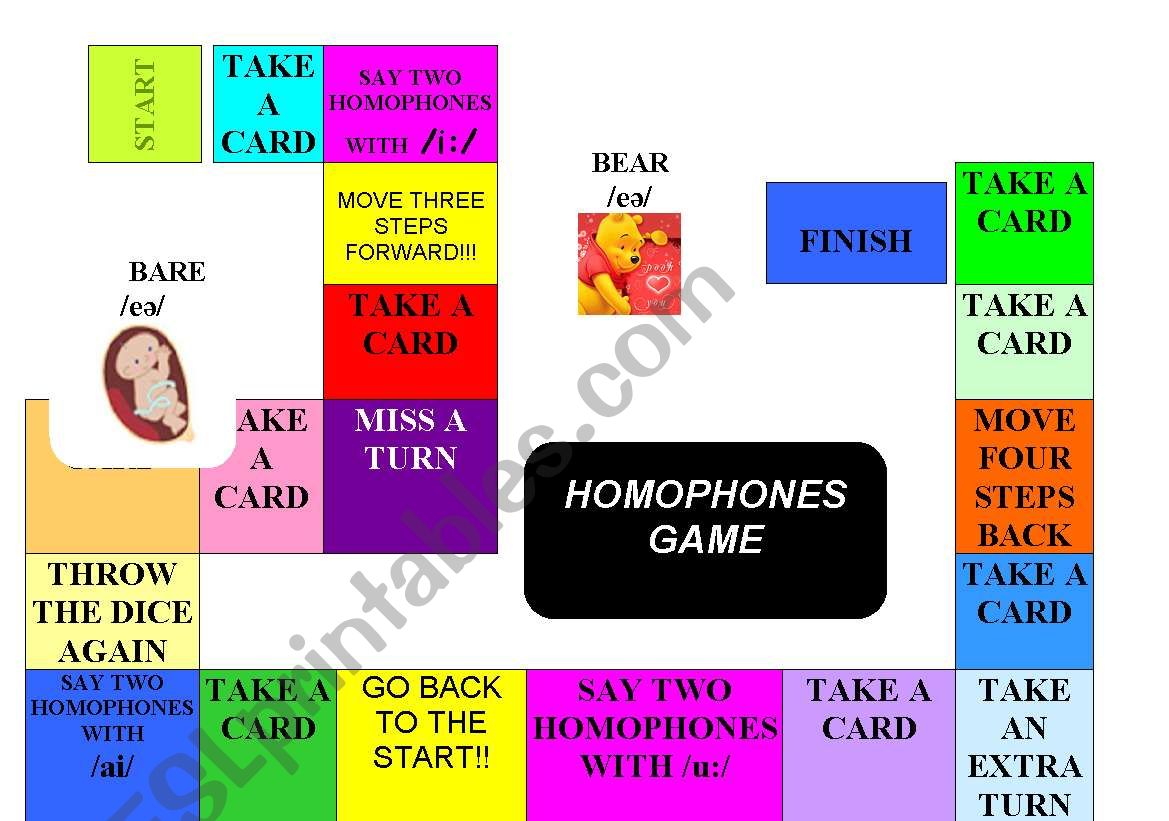 Hi, I made this game to practise English vowels and diphthongs in words that are homophones. In this way, they can improve there pronunciations and learn the different between words that sounds the same but are written in a different way and have different meaning too. The cards are in another worksheet. I hope you like it!
