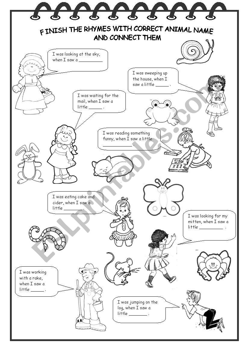 CHILDREN FINISH THE RHYMES WITH THE CORRECT ANIMAL NAME AND DRAW A LINE.