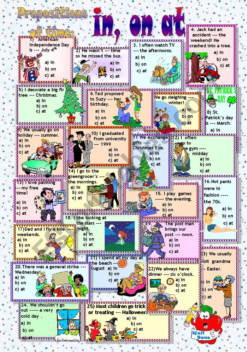 A worksheet for quick practise on the prepositions of time: in on and atin 25 multiple choice sentences. Thank you!