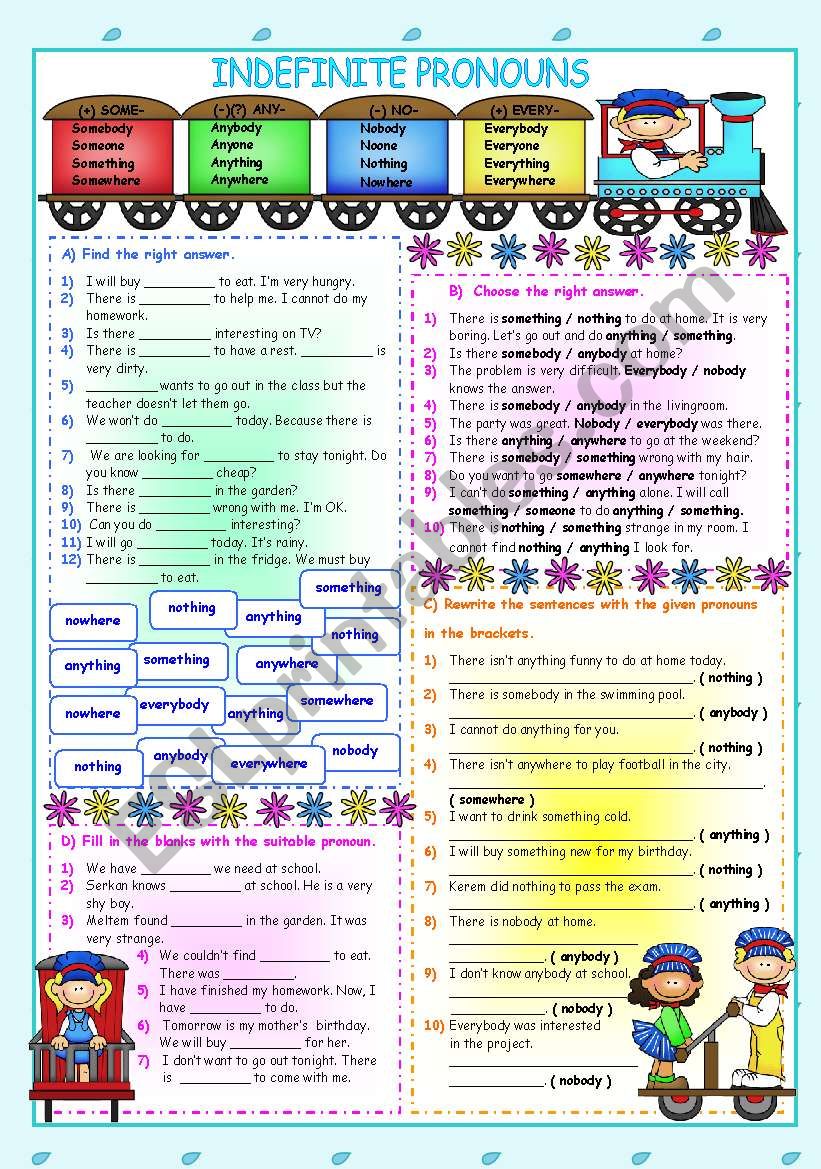 TUTORIALS for indefinite pronouns and 4 different exercises. The tasks are easy and clear if you will use it to teach this subject first.A test is also available about this topic today: http://www.eslprintables.com/printable.asp?id=511213#thetop. A special day for me today and I hope a nice weekend to everyone. HUGS from TURKEY :)