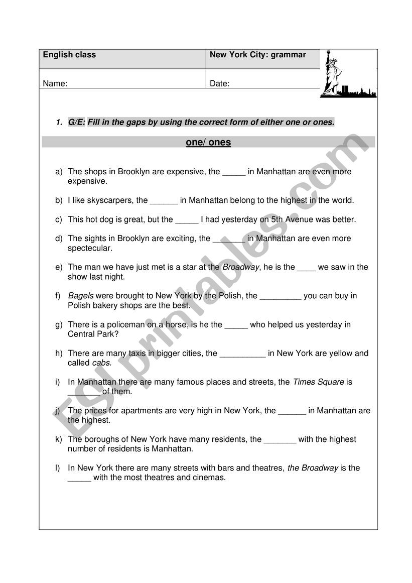 With this paper your students repeat the usage of the words one and ones as a substitute for a noun. The sentences are about the city of New York.