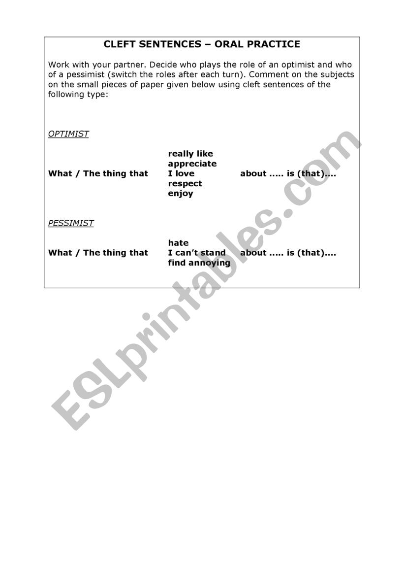 In this exercise the students can practice selected Cleft Sentences in the oral form in order to express their opinions about different subjects.