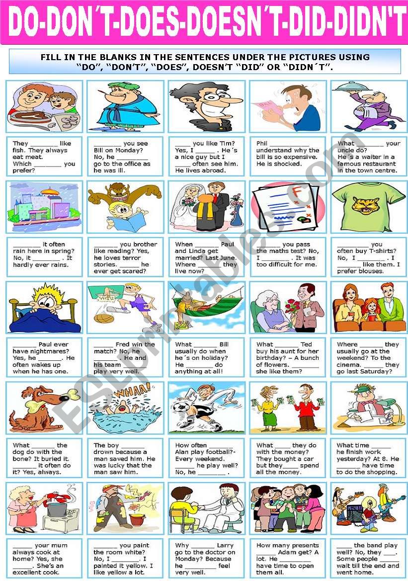 Students fill in the blanks in the sentences under the pictures with the appropriate auxiliary verb( “doâ€, “don’tâ€, “doesâ€, “doesn’tâ€, “did†or “didn’tâ€). I hope you like it and find it useful. Thanks a lot for your kind comments and have a nice evening/day!