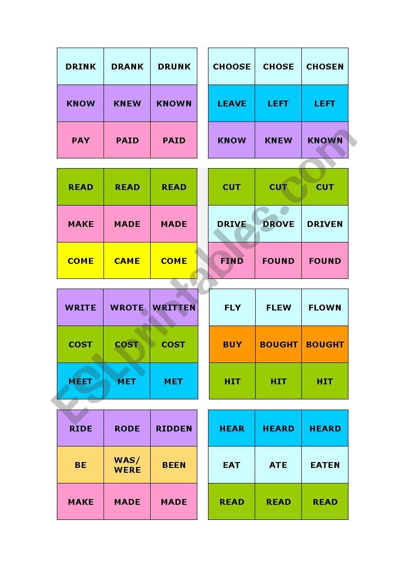 T says the infinitive and S who has the verb, say the past and past participle. When a S shouts BINGO, T takes the card and S only wins if he/she can remember and pronounce correctly the three forms.