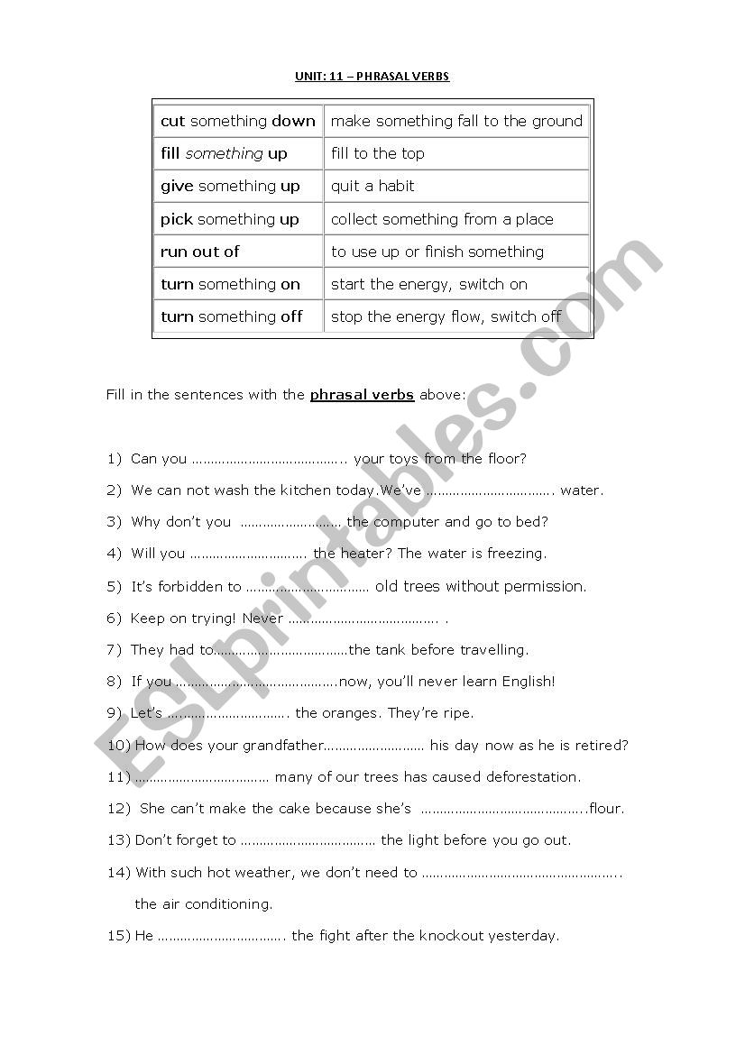 Definitions and sentences to be filled in with the following phrasal verbs: cut down, fill up, give up, pick up, run out of, turn on, turn off