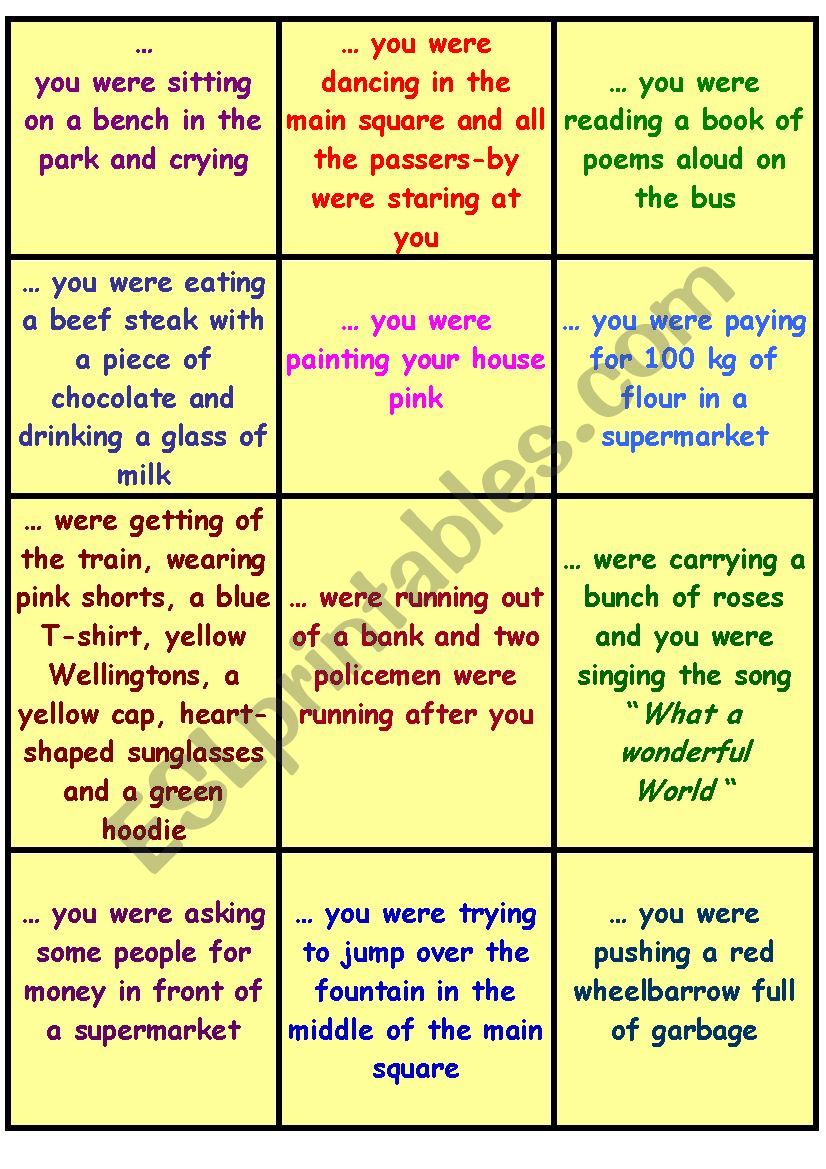 You can use these cards for a pair work as well as for a group work. Each student is given a card with a strange action, then she/he picks another student and asks them to come up with innocent reasons why they were doing those things. Before the student with a card starts reading the action, they can say: When I last saw you, you were... Of course, you can change the rules as you like. Enjoy!