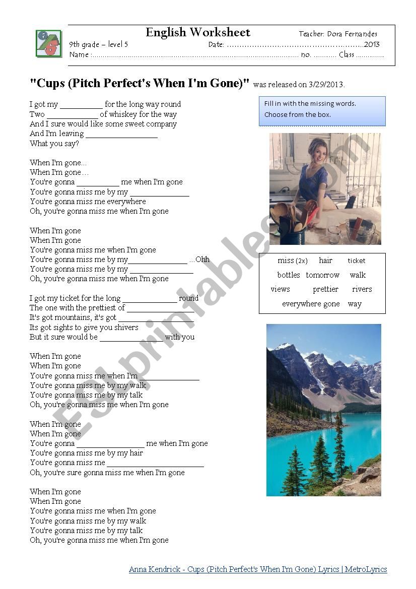 Fill in the gaps with the words from the box and sing this funny song. Watch the video from YouTube and practise with the cups with your students in class. Surely they´re gonna miss you when you´re gone...!