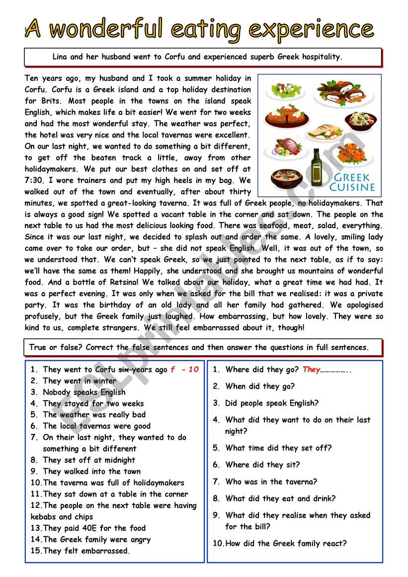 This is a RC about a holiday in Corfu. The couple gate-crash a private event. They read the passage and then do the true or false and answer the questions. A key is included. This is a bit of an urban legend, I guess!