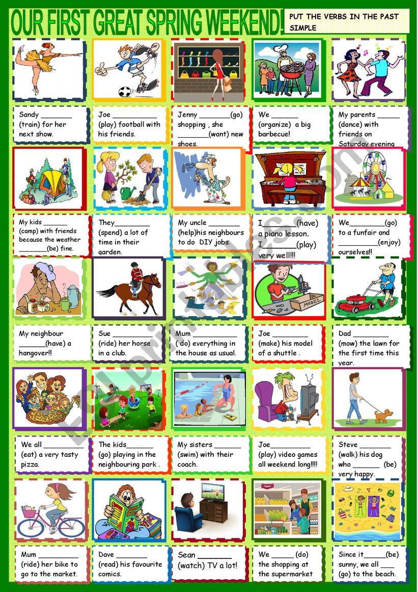 Here students put the verbs in the past simple to talk about the weekend then they can talk about their weekends,Thanks Mada for teh template, hugs! Sylvie!:)