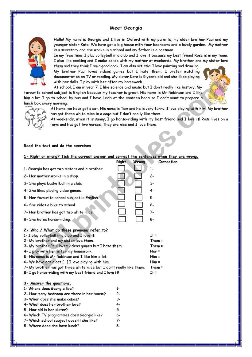 I created this worksheet to have my pupils revise about the simple present and pronouns. It can be used as a test. There are reading exercises, grammar exercises and writing. I hope you�ll enjoy it.