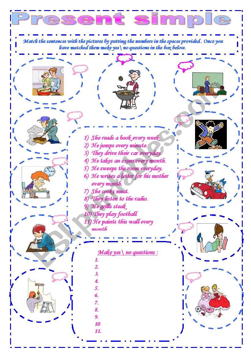 Hi. This is a work sheet about the present simple. I will ask sts to match the sentences with pictures then to make yes