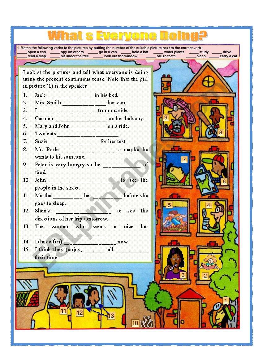 This worksheet includes an exercise of matching vocabulary actions to pictures and a seccond exercise where students have to put the verbs in present continuous using the pictures as clues. I hope you like it.