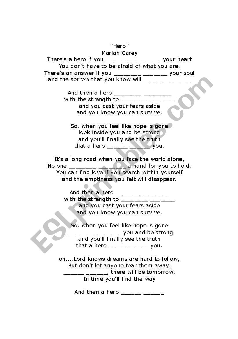 English worksheet: "Hero" Lyrics for Phrasal Verb Practice