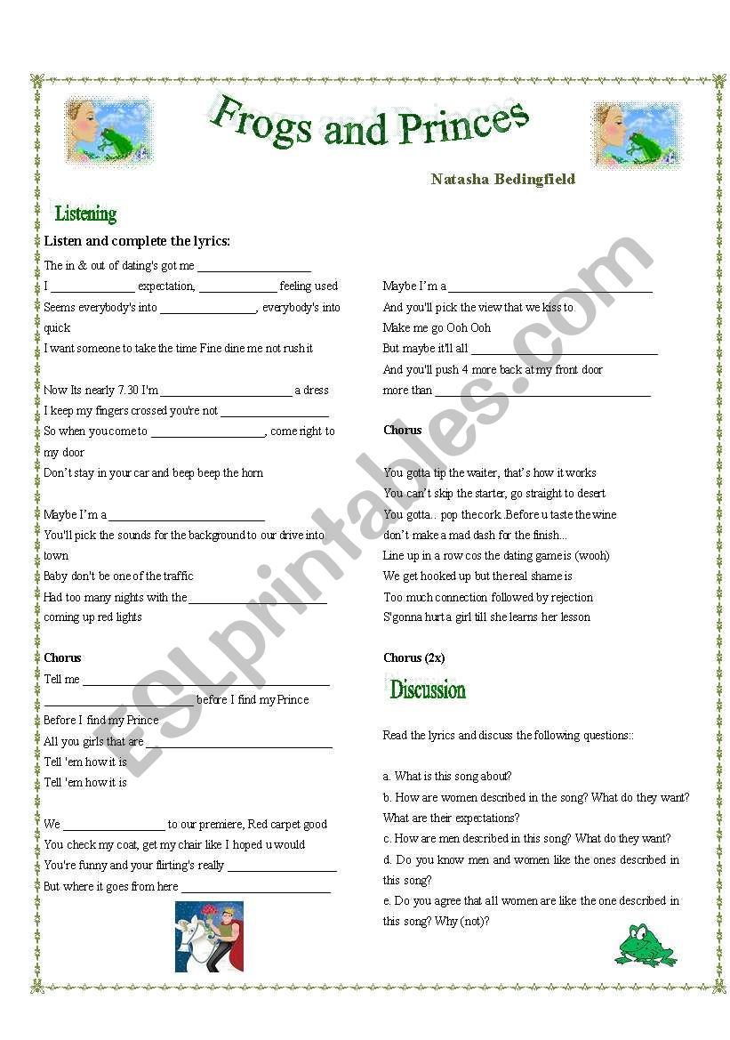 This is a great song to build up a discussion about relationships, and more importantly, about female and male stereotypes. Itīs really motivating and students participate a lot in class. I added some discussion questions as guide, but the teacher can also make different questions depending on the discussion. Have fun!