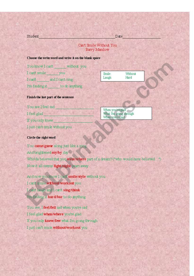 this is a beautiful love song to practice the negative form of can “CAN’T”, adults and maybe teenagers could enjoy this song. This worksheet has many listening activities which surely enhance the writing process and structures recognition.