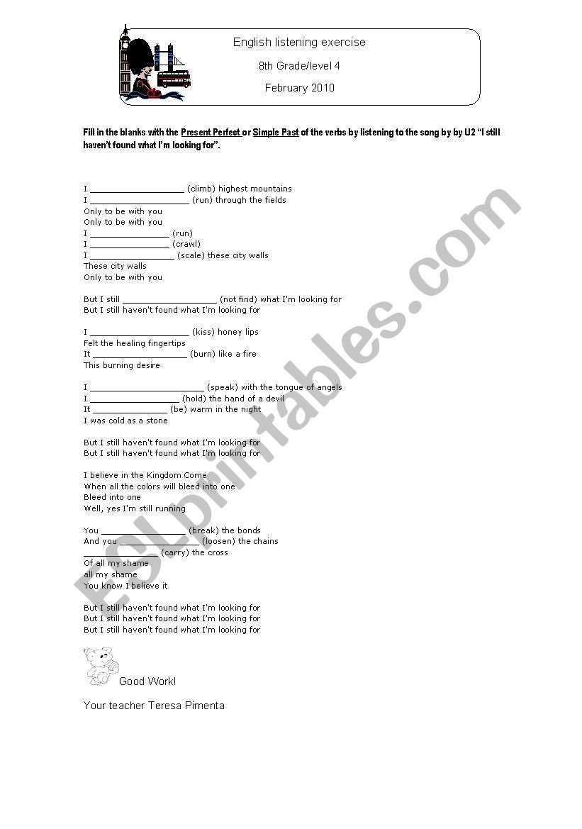 Students listen to the song ""I still haven´t found what I´m looking for" by U2 and fill in the gaps using either the simple past or the present perfect. I used this song to introduce that grammar subject.