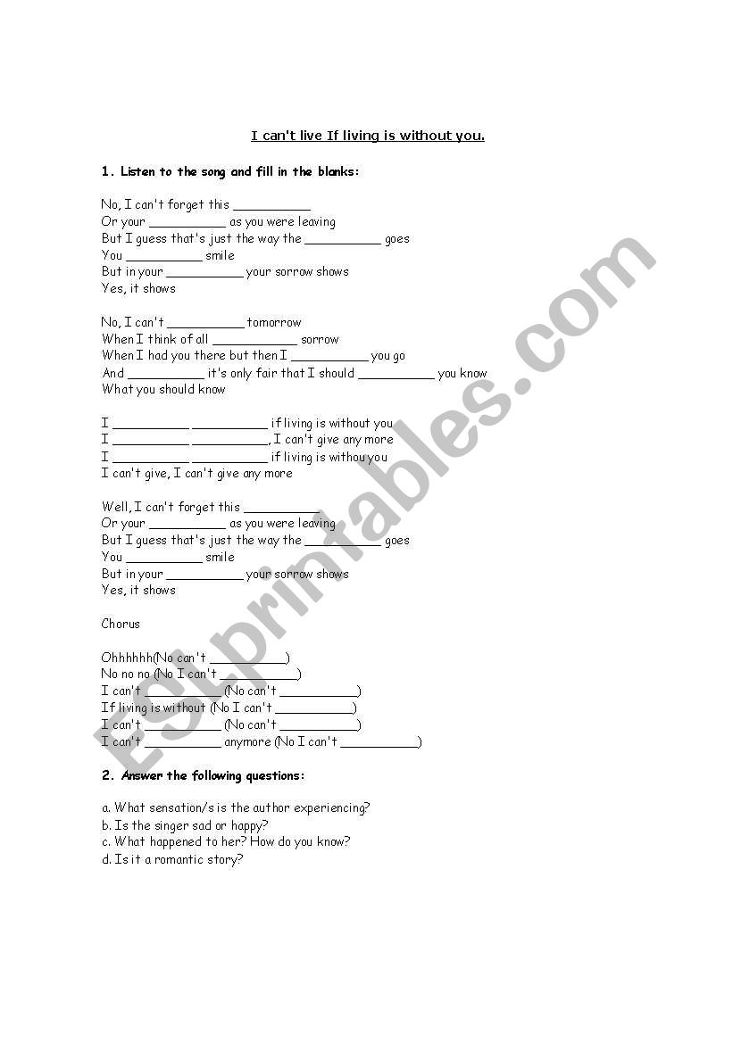 English worksheet: I canīt live if living is without you I canīt live if living is without you