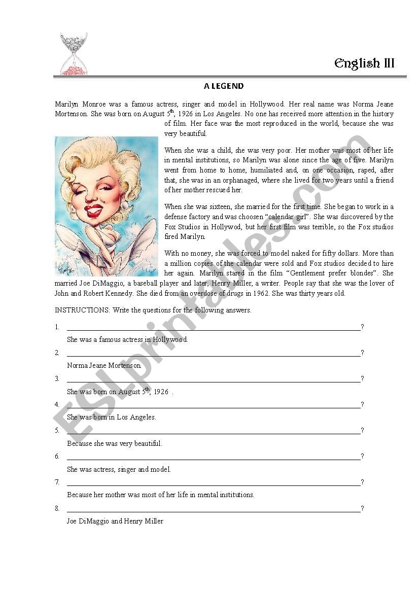 Reading worksheets > Biographies > Marilyn Monroe > Marilyn Monroe reading