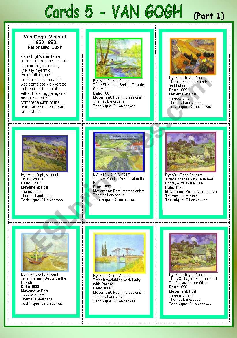 Cards about great artists and famous painting. This is the five: Van Gogh(with 06 pages). You can use these cards with conversation about art, about these great artists and each painting.