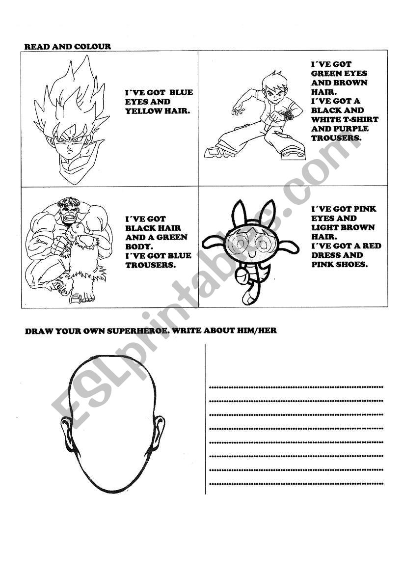 IT´S THE SECOND PART SO AS TO CONTINUE WORKING WITH SUPERHEROES. HERE STS. READ AND COLOUR THE PICTURE. FINALLY THEY DRAW THEIR OWN SUPERHEROE AND WRITE ABOUT HIM/HER.